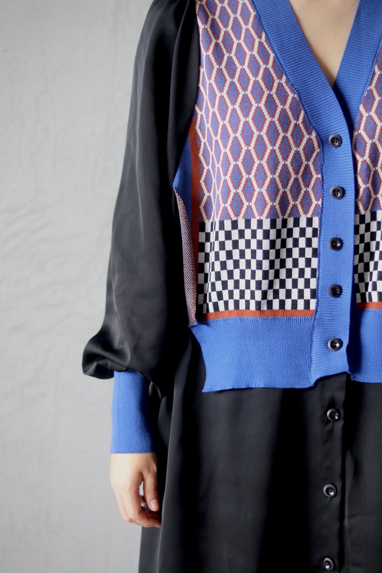 黒のシンプルなワンピースに、ニット素材で出来たリブと上半身見頃。