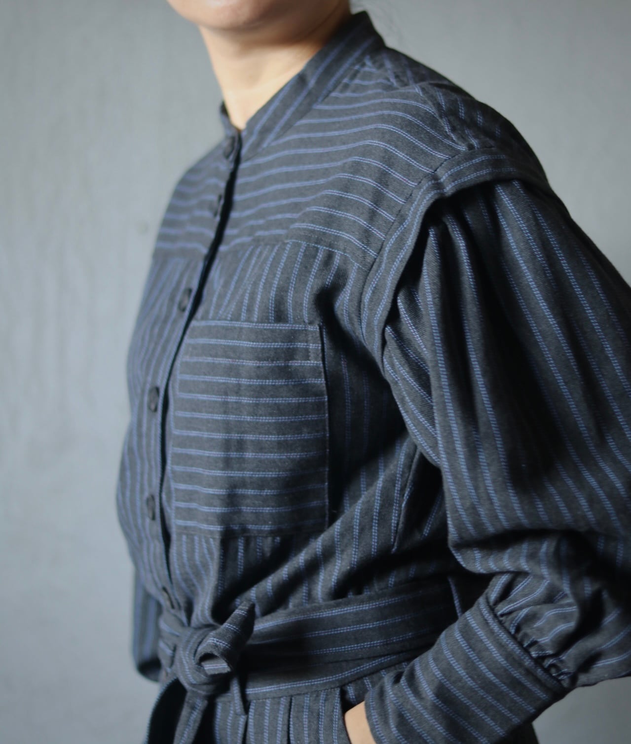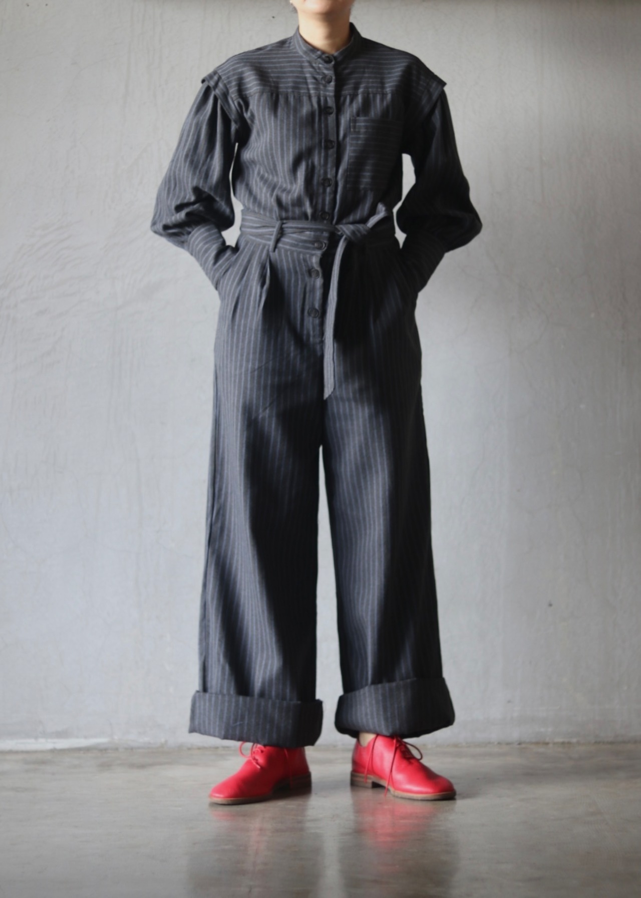 秋ジャケットに使用されそうな少し厚手の生地で仕立てられたサロペット。袖にはたっぷりと生地が使われて、ギャザーが入ったりカフスが長めだったりパンツスタイルですが、かわいさ◎