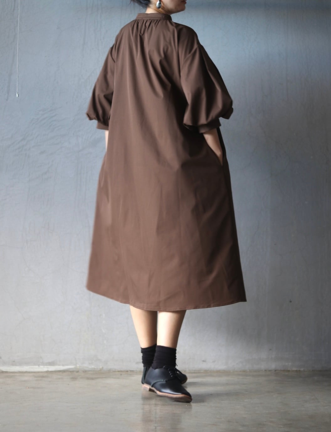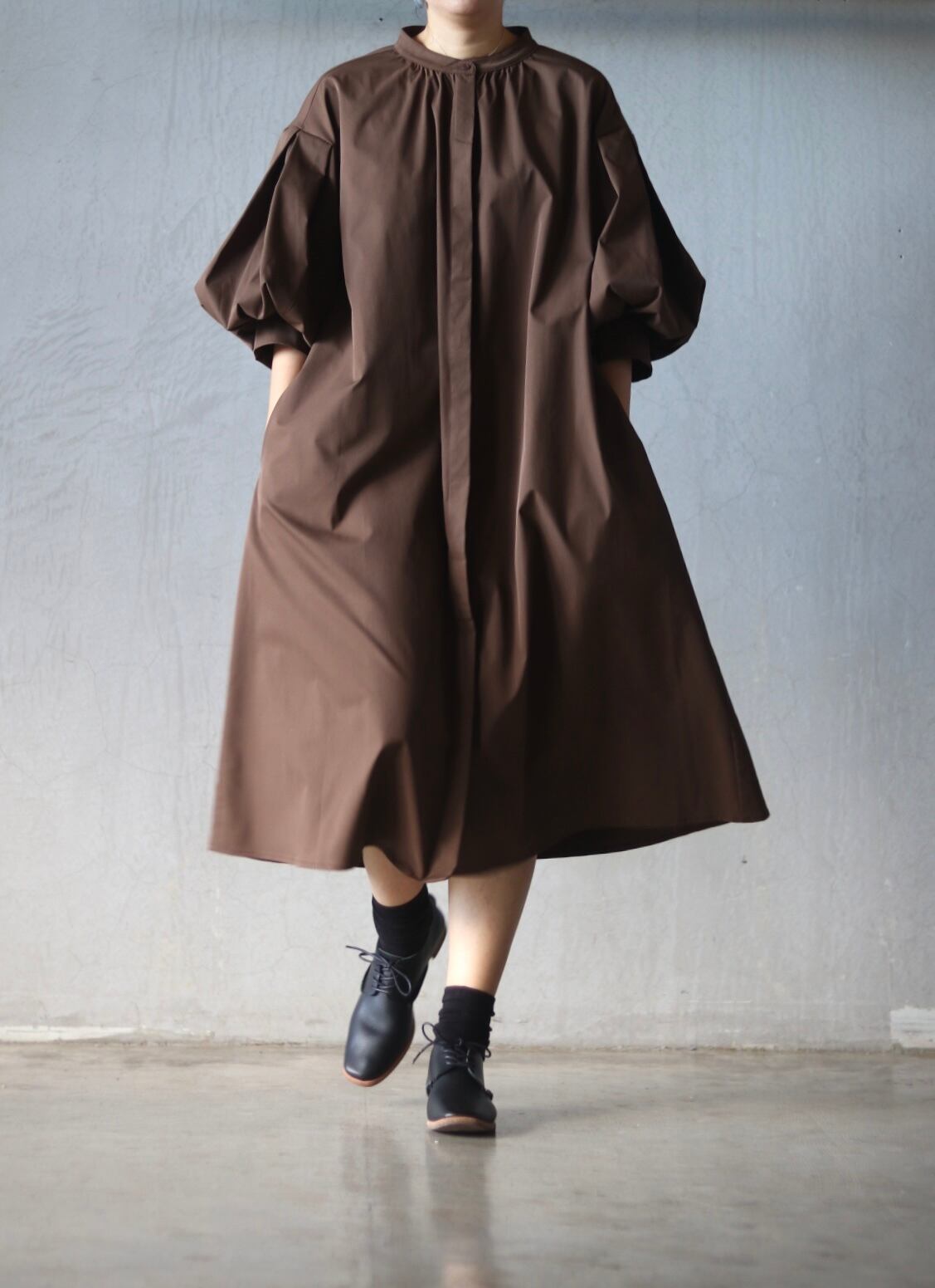 肩下からボックスプリーツが入っているので、肘の方にボリュームが集中していて大きく見えないバランスのいいワンピースになっております。