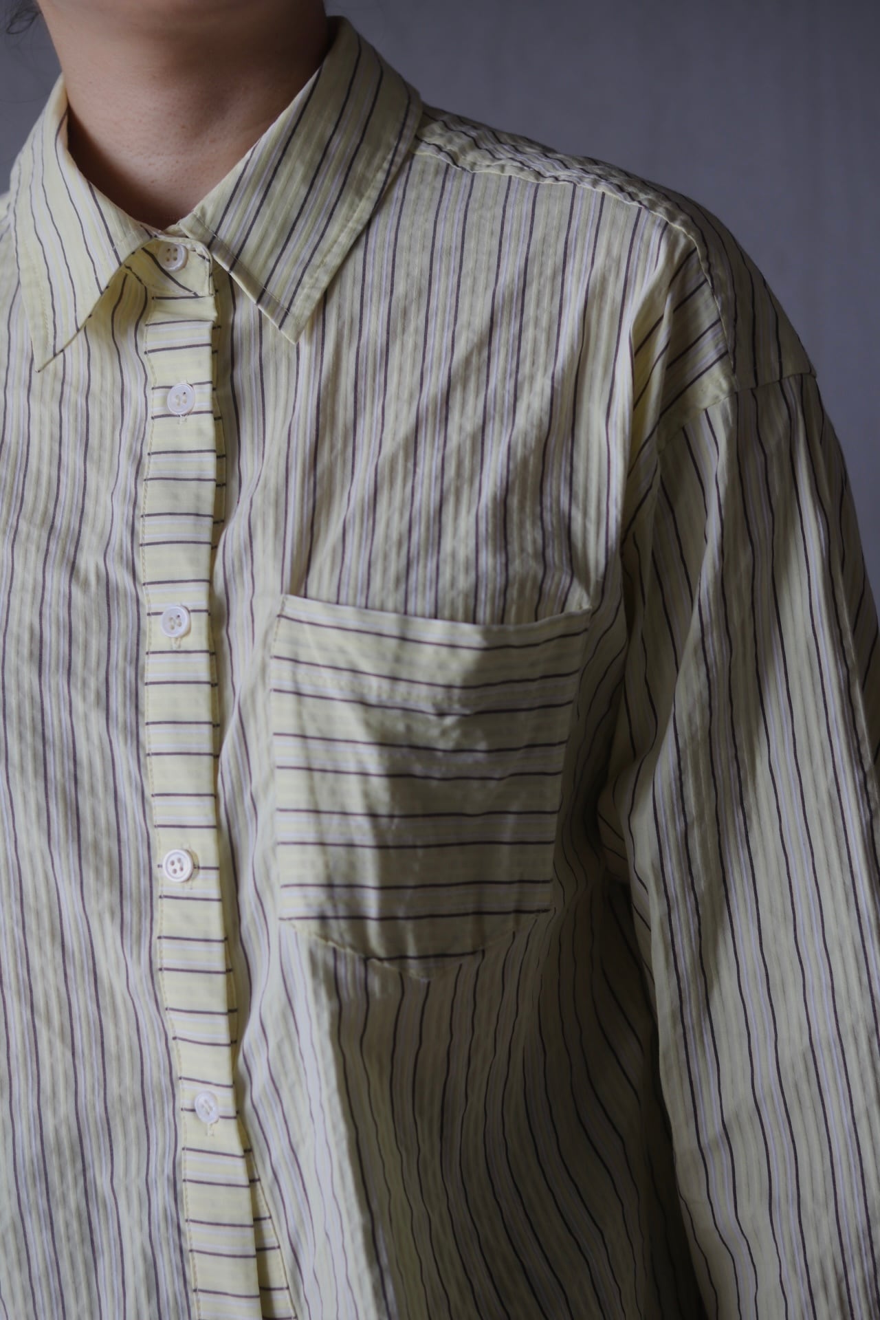 薄いレモンイエローとブラウン、ホワイトのストライプが綺麗だけどカジュアルな素材。