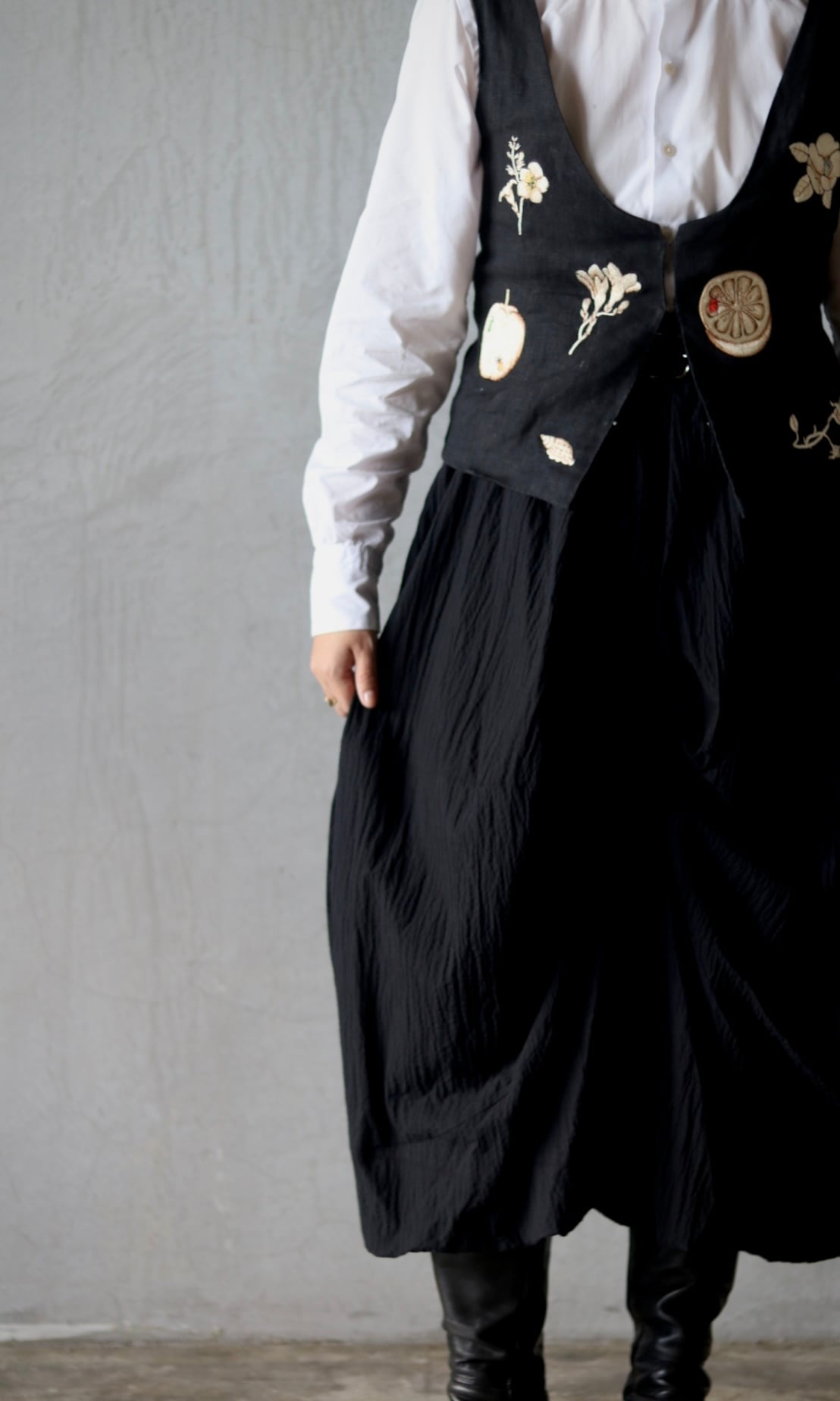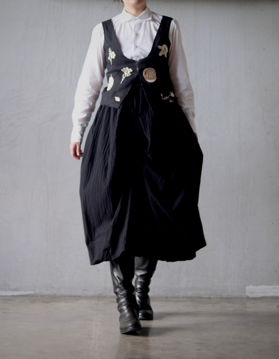 バールンスカートに、タックや摘みが不規則に入った個性的なスカート。